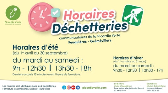 Nous vous informons que dès la semaine prochaine, les déchetteries de la Picardie Verte basculent en horaires d’été.